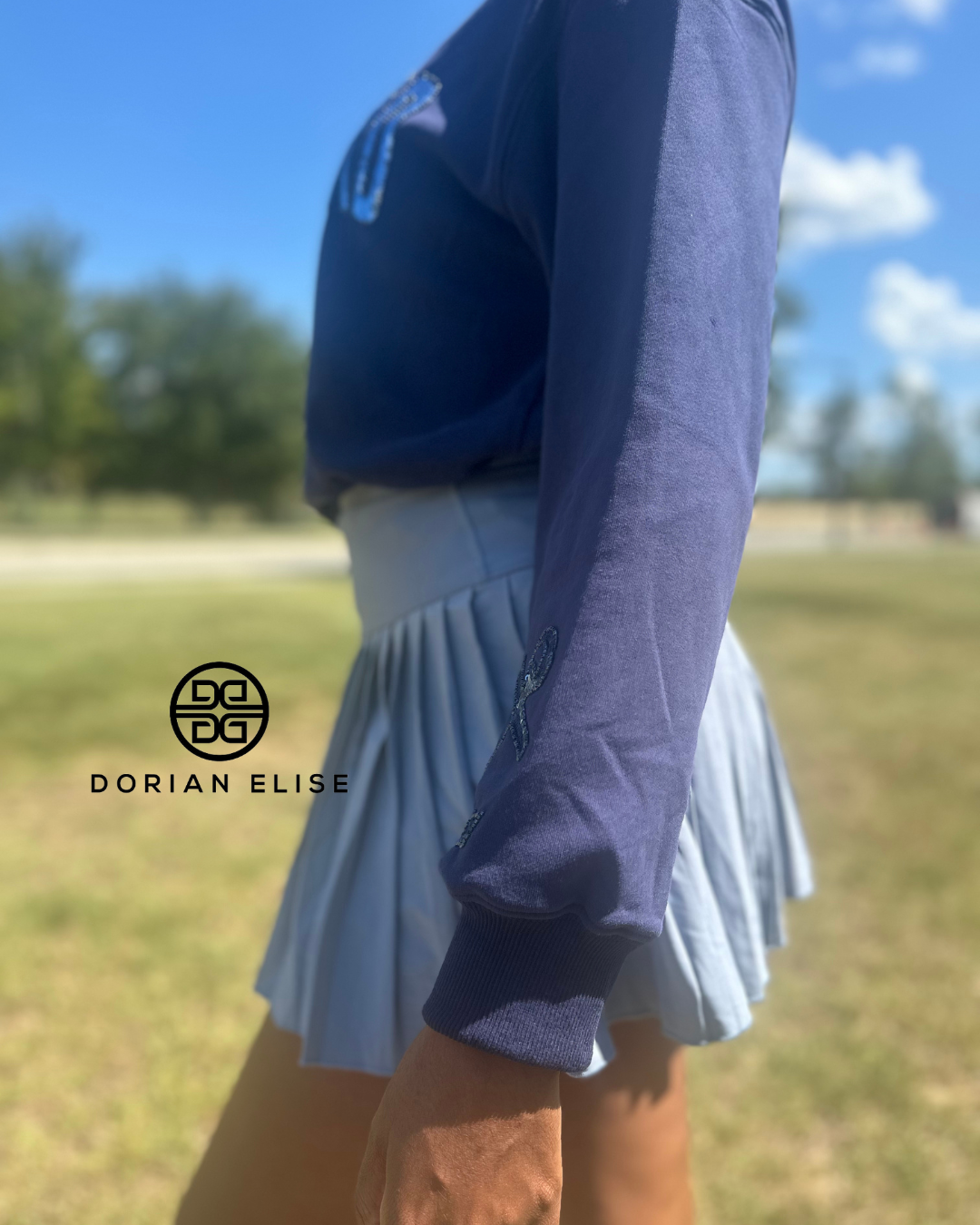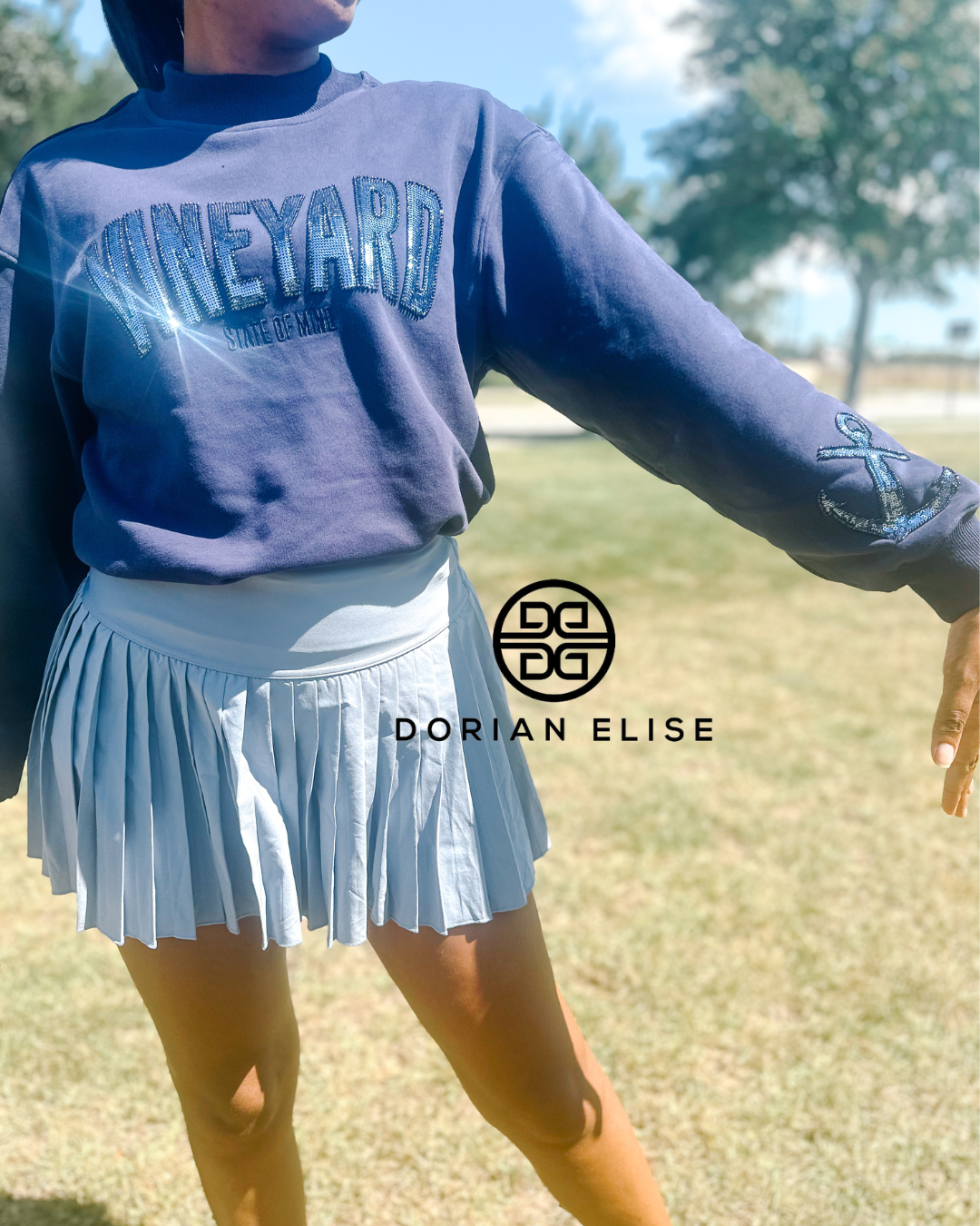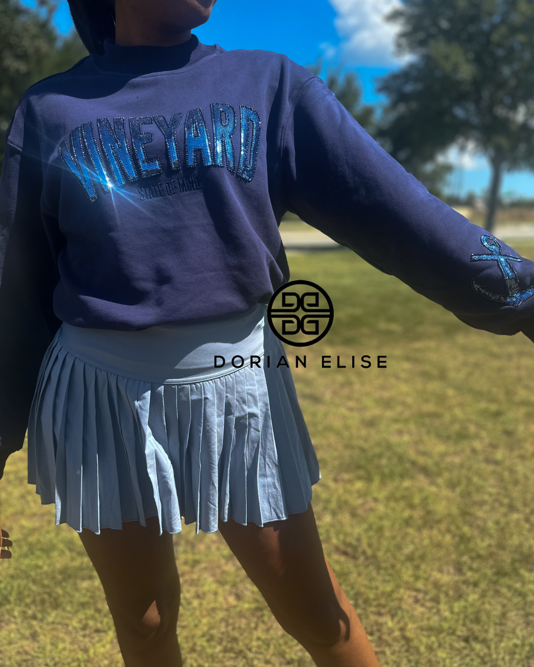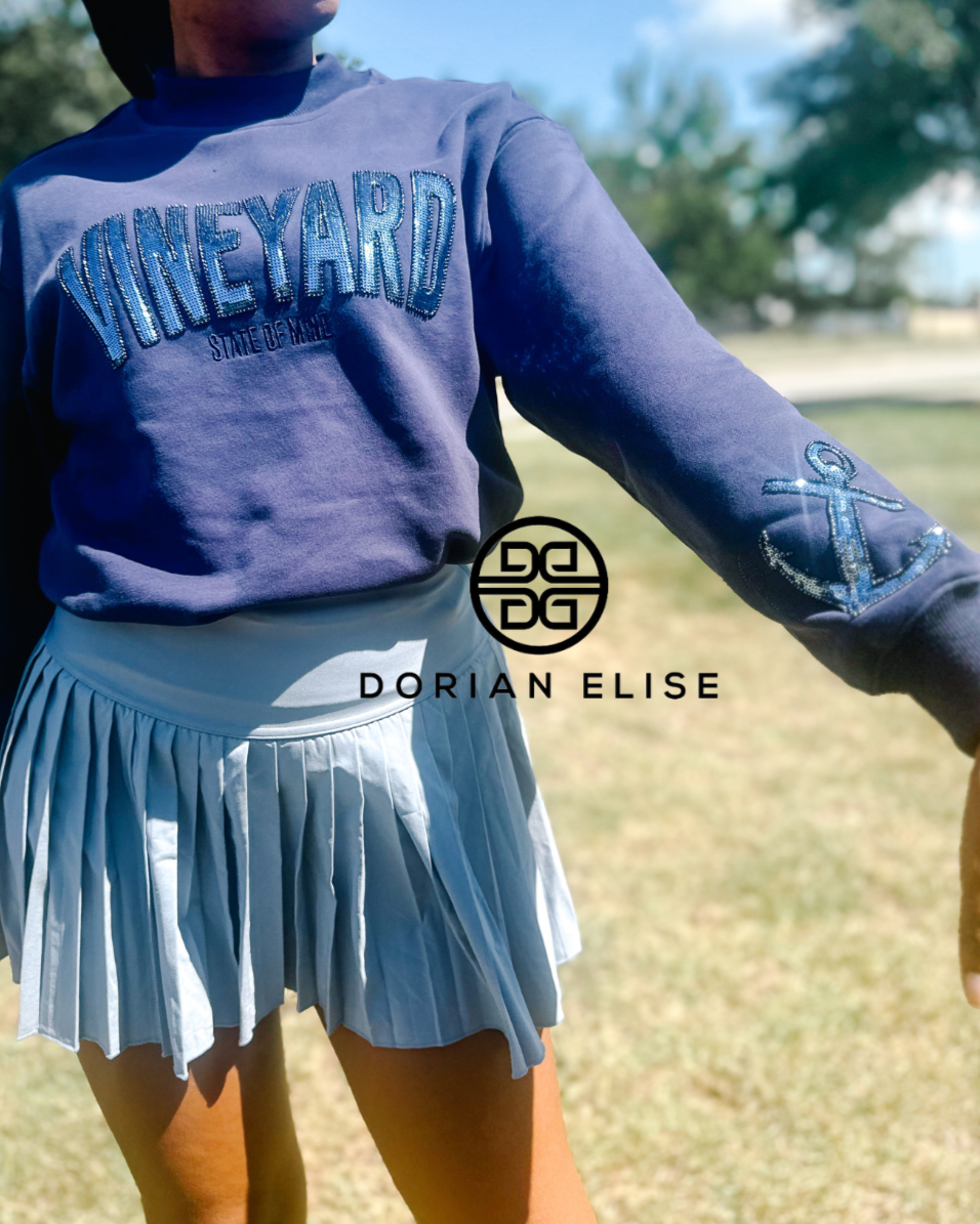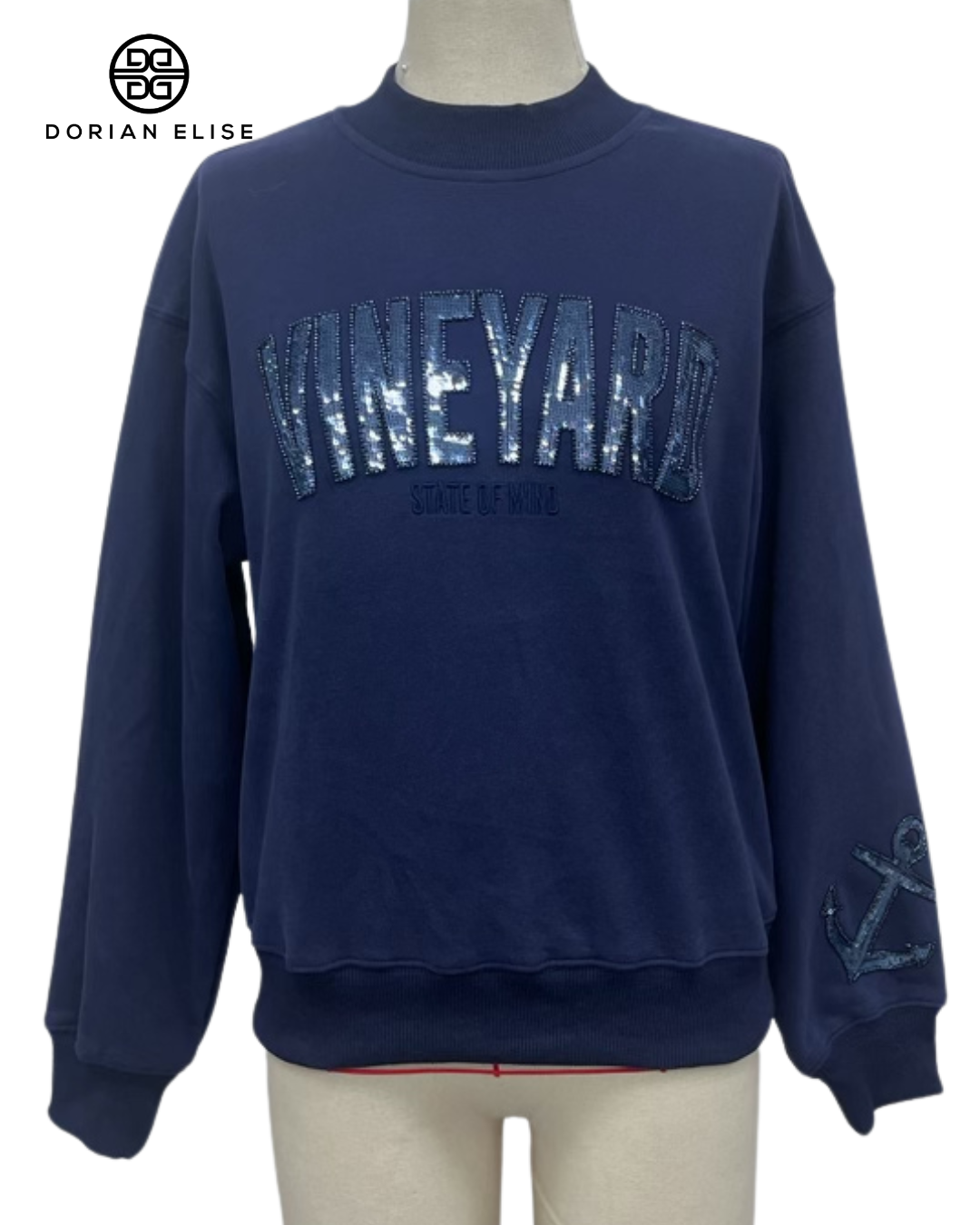 This hand-sequined and hand-beaded sweatshirt, inspired by the timeless charm of Martha's Vineyard, features a mock neck that blends comfort with striking detail. An anchor on the sleeve adds a nautical touch, making it perfect for showcasing your love for the Vineyard while making a statement in any season.